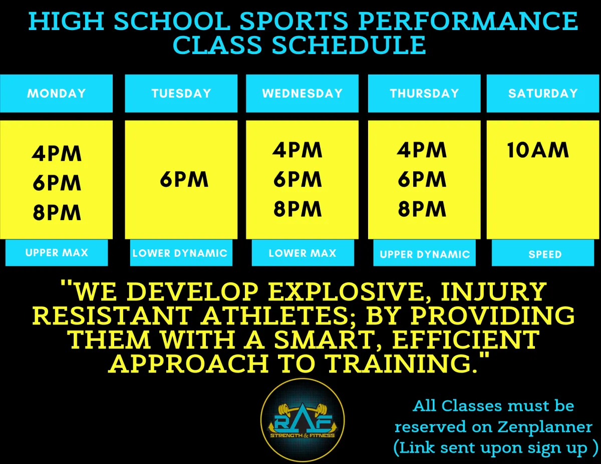 This program is designed for all Male/ Female high School Athletes (9th-12th grade). It entails a program design to not only make you stronger, but overall a better athlete. It starts with a workout specific warm up, followed by a complex exercise, accessory exercises and conditioning. The goal of this class is to make our athletes move better/ faster by developing strength, mobility, balance and core strength!